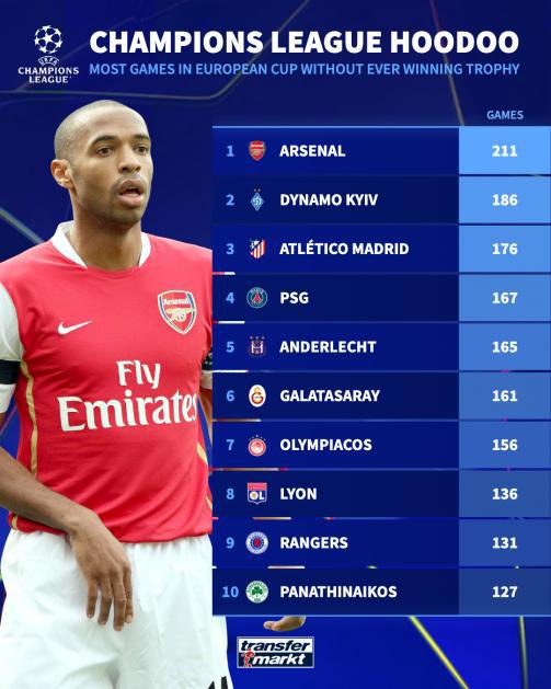 不陪你玩了?阿森纳211场欧冠比赛仍未夺冠排名第1&巴黎167场第4